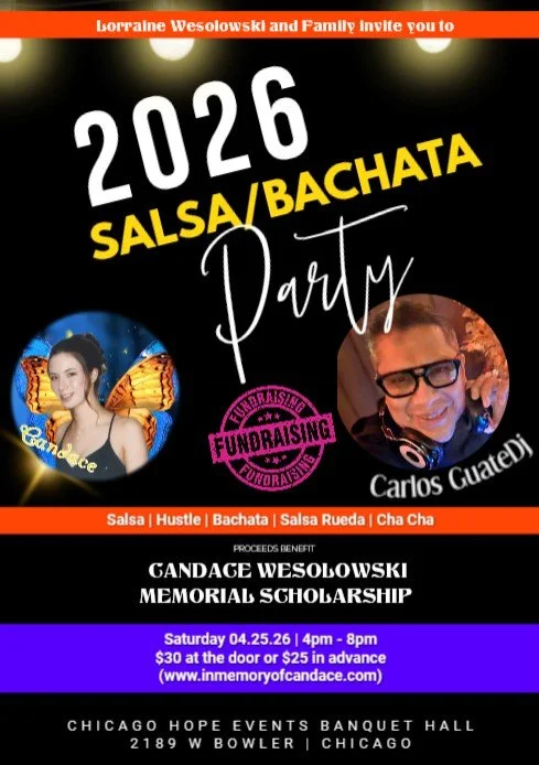 The 3rd annual Candace Wesolowski Memorial Scholarship fundraiser , a non profit organization, will be held on April 25, 2026 at the Chicago Hope Events Banquet Hall at 2189 W. Bowler St., Chicago, IL. The Chicago Hope Events banquet hall and chapel is located on the Near West Side off Ogden Ave and Taylor St. Ample parking is available - Access to both patio and banquet hall when renting.